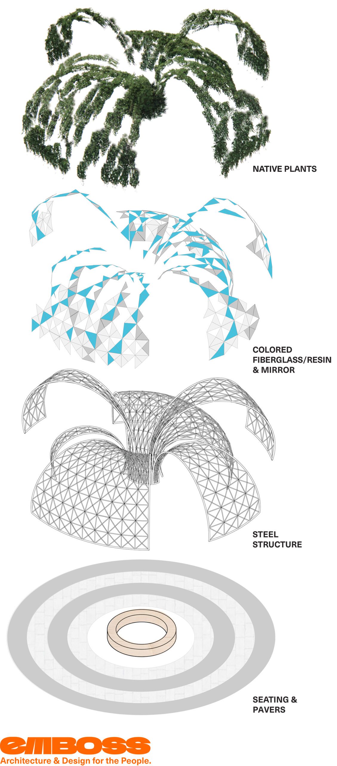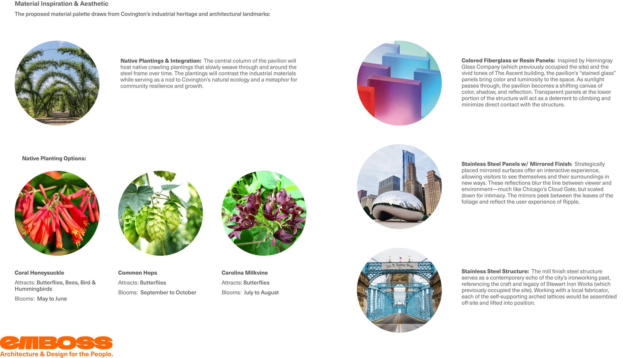 Emboss designed “Ripple.” Ripple is a landmark pavilion designed to embody the spirit of Covington—its history, its community, and its bold trajectory forward. As an architectural sculpture, it evokes the image of a single drop creating expanding ripples: a metaphor for how individual and collective actions shape a community over time. Positioned at a central point within the new Covington Central Riverfront (CCR) neighborhood, The Ripple is an open, accessible, and reflective space where visitors can gather, contemplate, and connect.